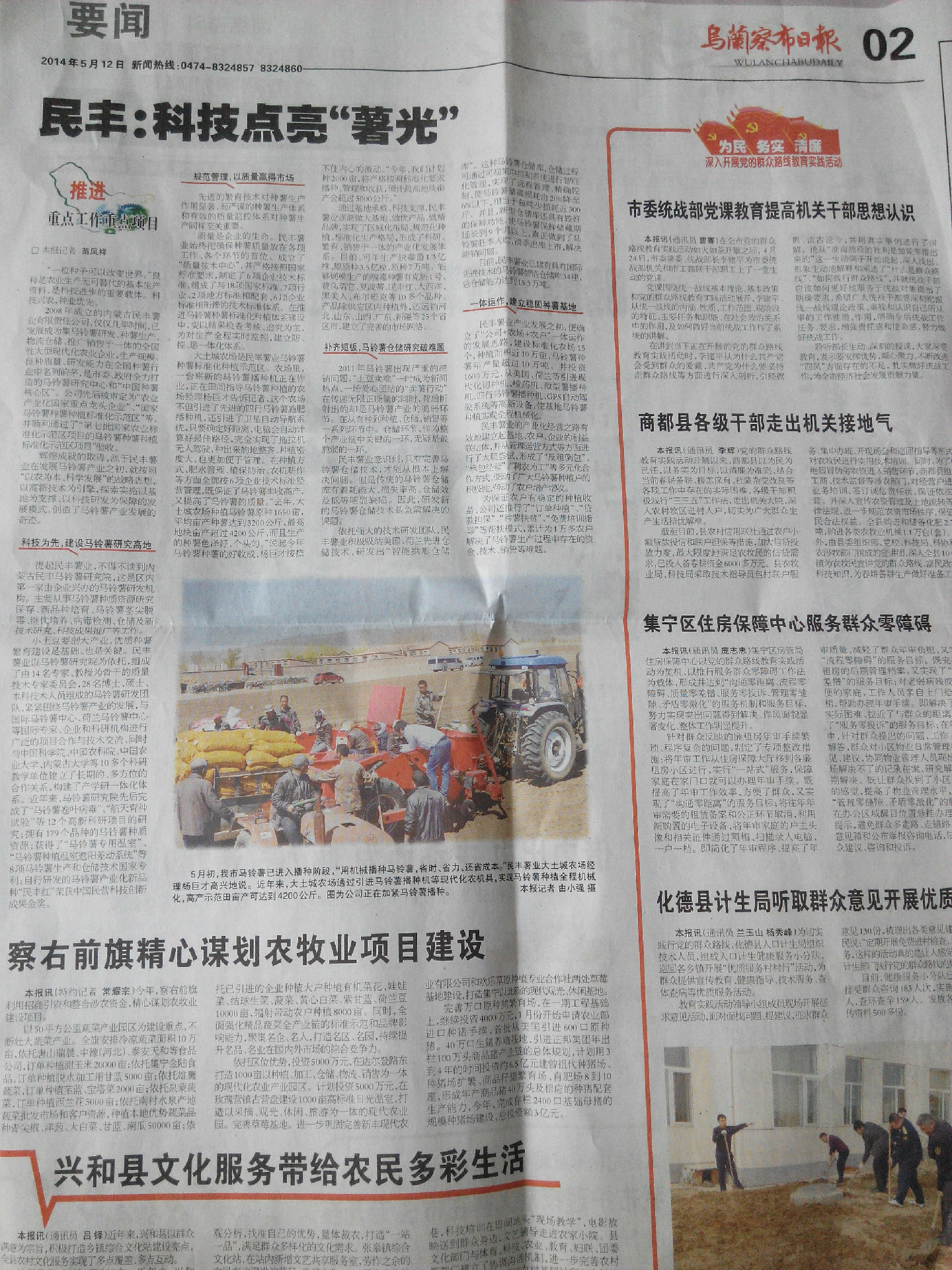 2014年5月12日,烏蘭察布日?qǐng)?bào)發(fā)表《民豐:科技點(diǎn)亮“薯光”》一文。